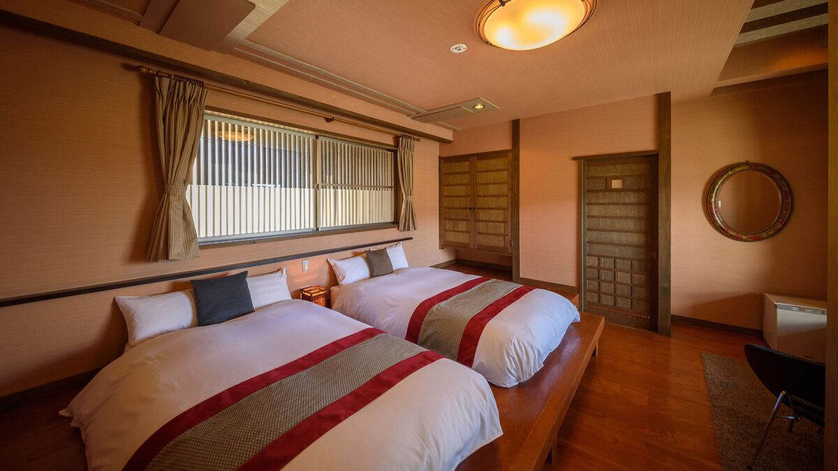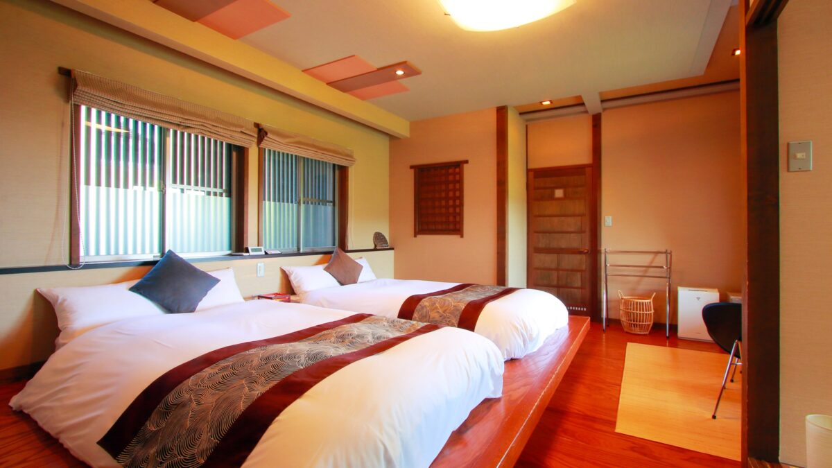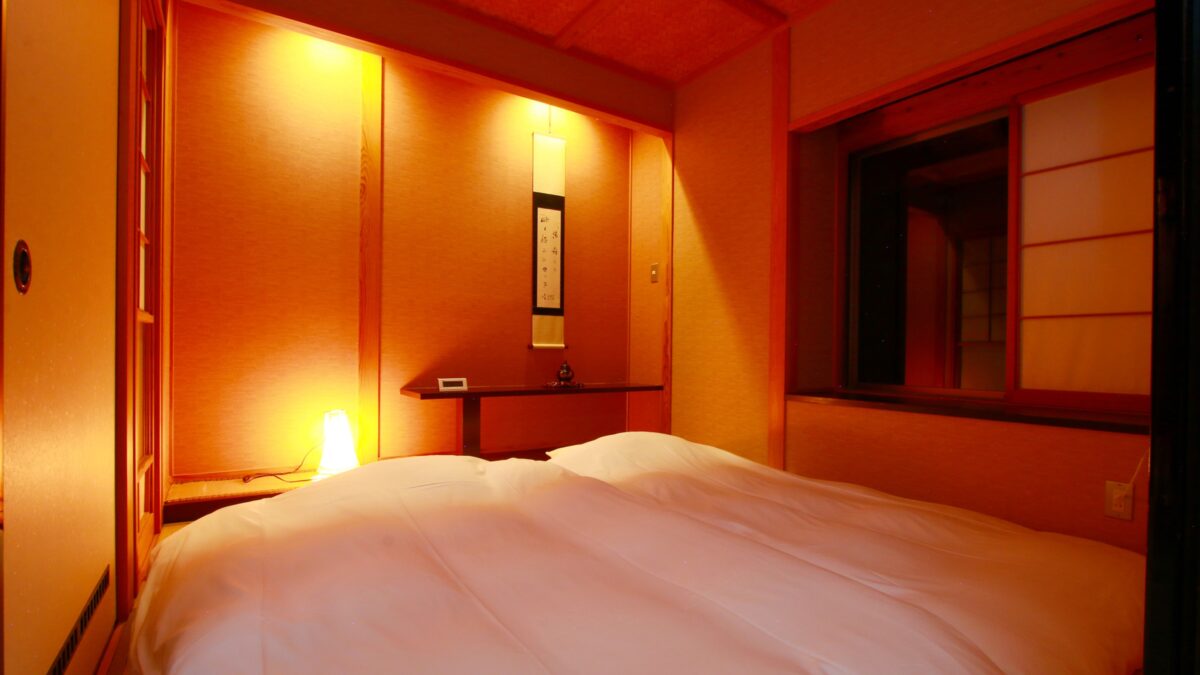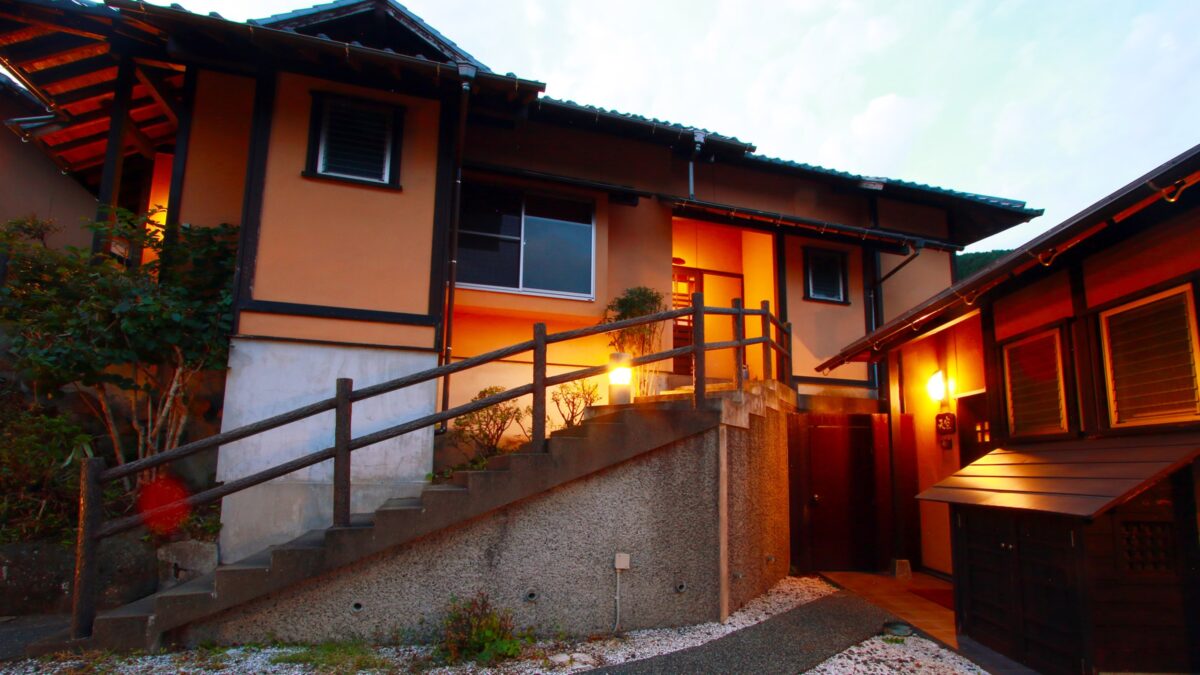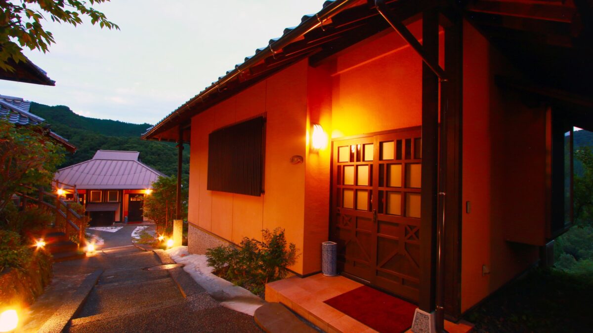 花灯りの客室は、由布の森に寄り添うように点在する別館・離れ(全8棟)。すべての客室に内湯と露天風呂を備え、湯平のやわらかな湯を自分たちの時間で楽しめます。露天は岩造りや御影石造りのしつらえで、谷側の眺望や山々の稜線、季節の気配を間近に感じられるのも魅力。