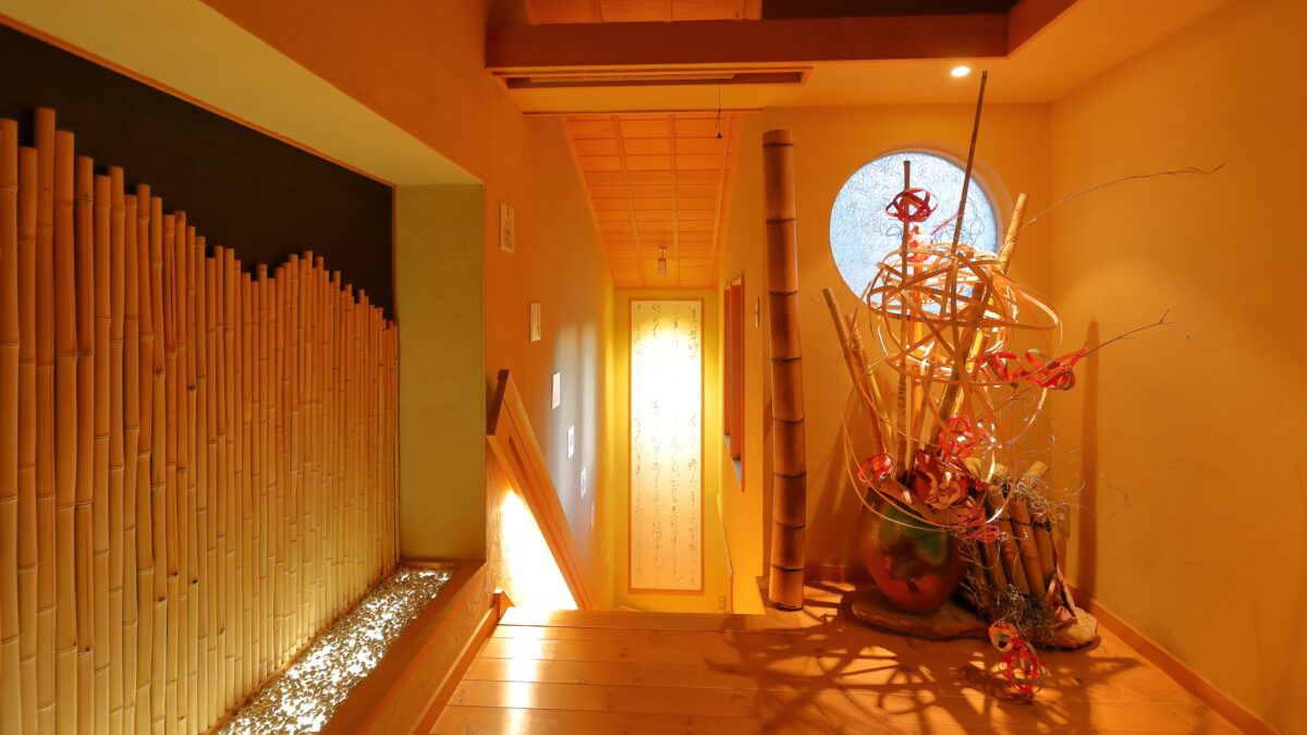 朝は天窓からやさしく差し込む自然光、夜はライトアップされた竹林が幻想的に浮かび上がり、まるで“かぐや姫”の物語の中にいるようなひとときを演出します。
